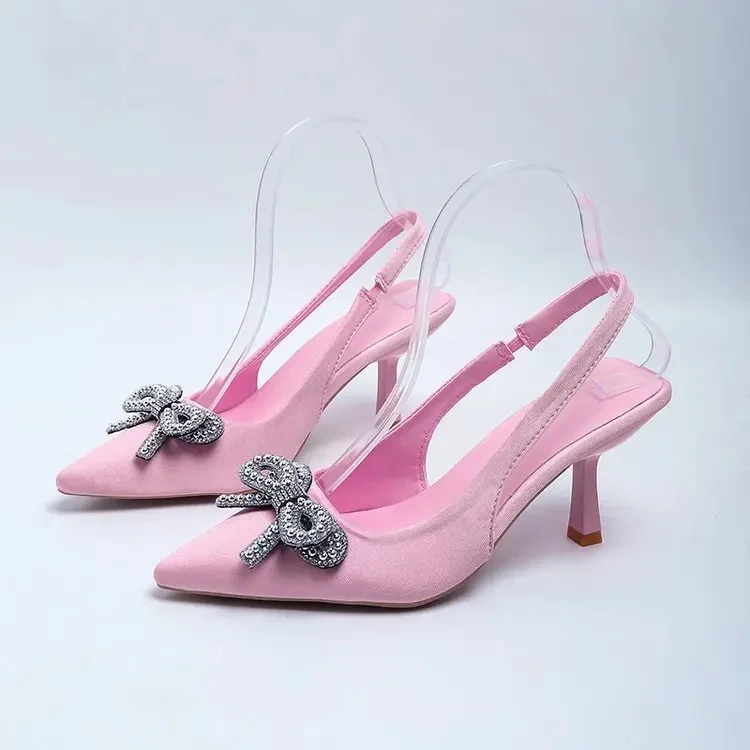 حذاء كعب عالي وردي أنيق ستيلتو مع أربطة كريستالية على مقدمة الحذاء، مثالي للمناسبات الرسمية والسهرات أو لإطلالة مكتبية أنيقة.