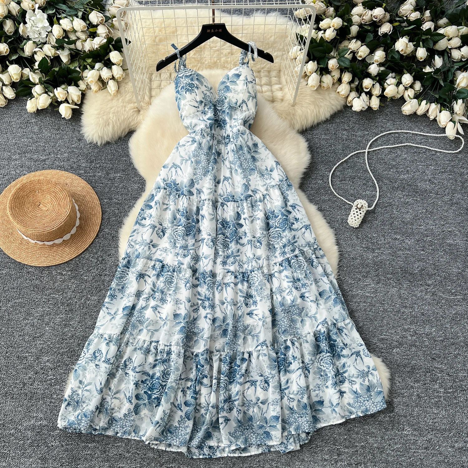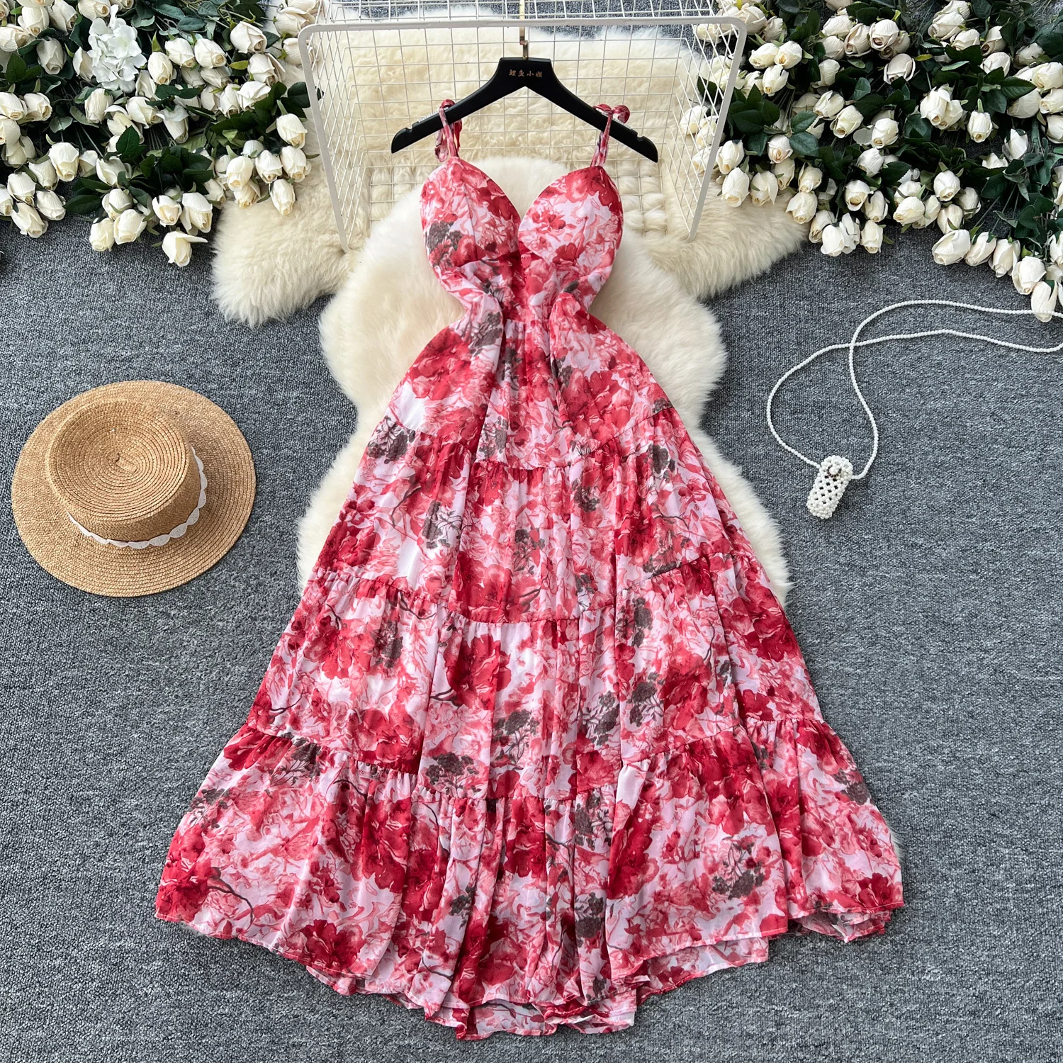 فستان عتيق من الشيفون بدون أكمام ، طباعة أنيقة ، رقبة حرف V أنيقة ، موضة فرنسية ، فساتين سهرة ، شارع مرتفع ، ملابس مثيرة ، صيف